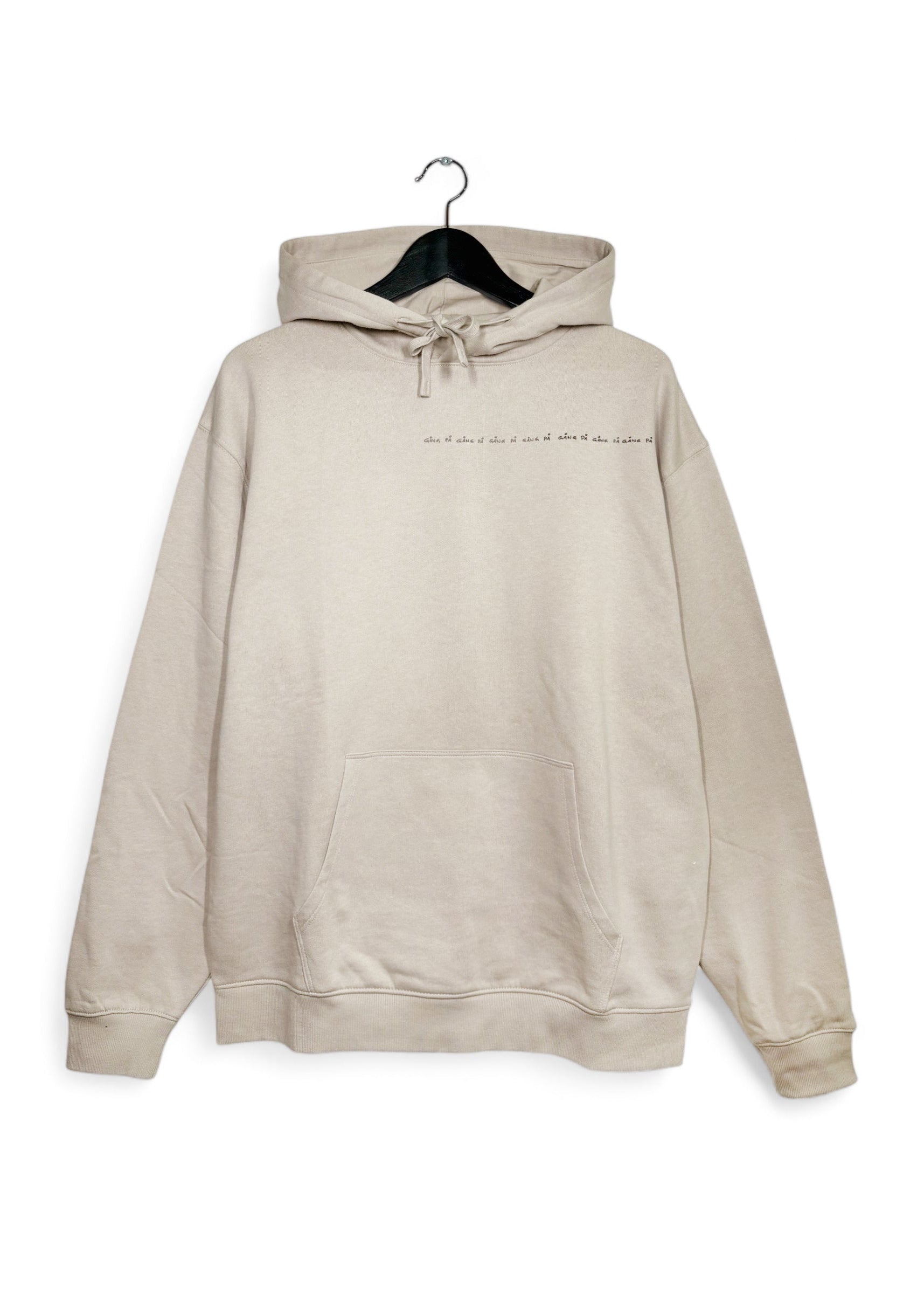 Klassisk hoodie. Avslappnande passform med huva, framficka och ribbade muddar. Second hand. Tryck: gång på gång på gång...